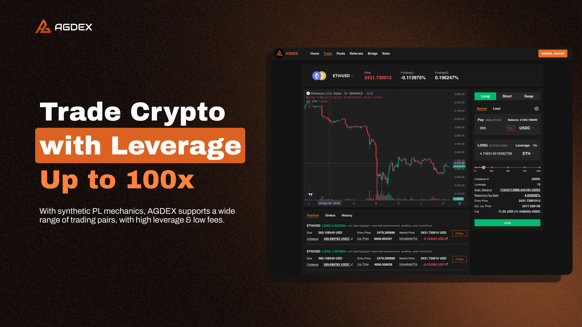 AGDEX is a pioneering on-chain derivatives & swap protocol. It provides traders with zero slippage and high leverage trading services utilizing a synthetic architecture to improve capital efficiency.